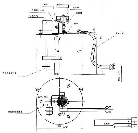 6、本泵設(shè)有低位報警裝置,報警后應(yīng)及時地向油筒內(nèi)充填潤滑脂。