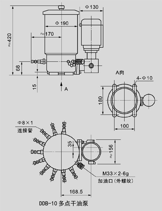 2、DDB-10型多點干油泵使用前先向一級減速箱內(nèi)加入HL-20齒輪油至油標(biāo)規(guī)定液面。