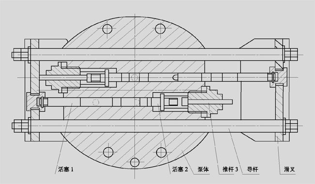 泵體內(nèi)有二組活塞,每組活塞由1工作活塞和2控制活塞組成,當(dāng)一組活塞中的工作活塞完成吸油過(guò)程時(shí),另一組 活塞中的工作活塞則把潤(rùn)滑脂壓向出油口。如下圖所示,當(dāng)滑叉向左運(yùn)動(dòng)時(shí),上組活塞完成吸油,下組活塞完成壓油, 開(kāi)始新的工作循環(huán)。這時(shí)下組活塞1、2向左運(yùn)動(dòng),活塞2在彈簧力作用下到達(dá)極限位置關(guān)閉出口,而活塞1繼續(xù)向左 運(yùn)動(dòng),這時(shí)活塞2和1之間形成真空,其真空度隨活塞1的左移不斷增大,滑叉運(yùn)動(dòng)到極限位置活塞1打開(kāi)吸油口,潤(rùn) 滑脂從吸油口吸入,如彈簧力不足,沒(méi)將活塞2推到極限位置,此時(shí)推桿3會(huì)在滑叉的推動(dòng)下強(qiáng)制地把活塞2壓到極限 位置,同時(shí)上組活塞1、2、3向左運(yùn)動(dòng),活塞1先關(guān)閉吸油口,被吸入的潤(rùn)滑脂在活塞1的推動(dòng)下向左移動(dòng),當(dāng)活塞2 把出油口打開(kāi)時(shí),活塞2和推桿3的運(yùn)動(dòng)也就停止,活塞1繼續(xù)左移,把潤(rùn)滑脂從出油口壓出,活塞1、2接觸滑叉也 已運(yùn)動(dòng)到極限位置完成半個(gè)循環(huán)的工作,如此周而復(fù)始地循環(huán),二組活塞交替地將潤(rùn)滑油脂從出油口壓送出來(lái),壓出 的潤(rùn)滑脂經(jīng)泵裝置連接法蘭上的過(guò)濾器過(guò)濾后向系統(tǒng)供送。