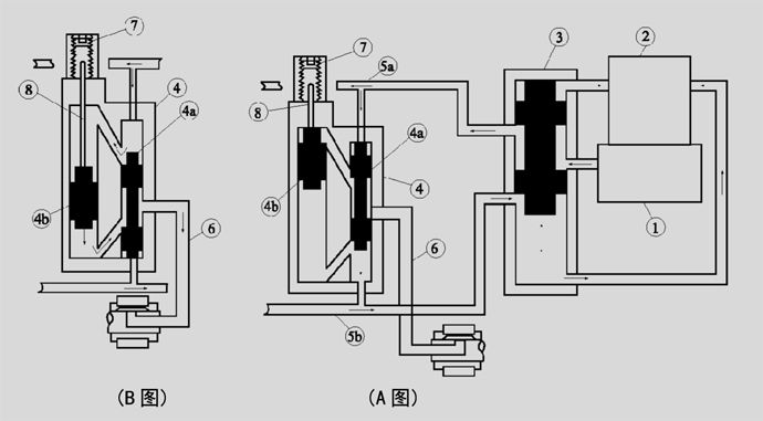 如下圖所示,潤滑泵①從貯油器②吸入潤滑脂,經(jīng)過換向閥③由供油管5a輸送到分配器,進入分配器后加壓于先 導(dǎo)活塞4a。先導(dǎo)活塞下腔與供油管5b連通,經(jīng)換向閥③向貯油器開放。(A圖)