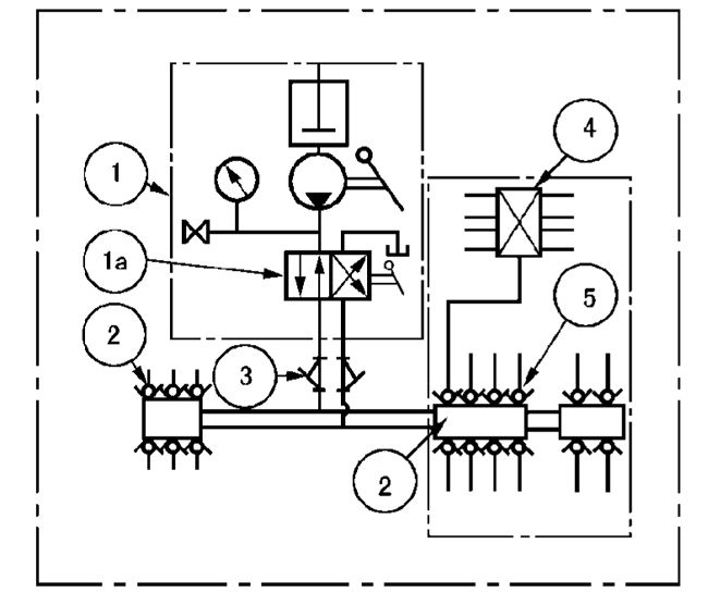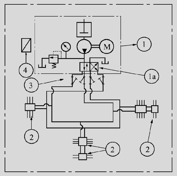 液壓換向閥1a具有切換兩條供油主管和控制供油主管末 端壓力的功能,當供油的主管末端壓力達到液壓換向閥的設(shè)定壓力時,液壓換向閥換向,并向電控箱發(fā)送信號,潤滑泵① 停止,系統(tǒng)一次給油完成。經(jīng)過設(shè)定的時間間隔后,系統(tǒng)再次工作,從另一條主油管供油。