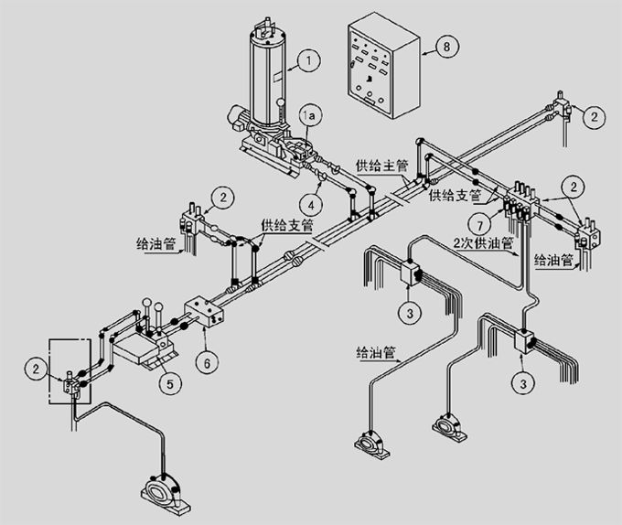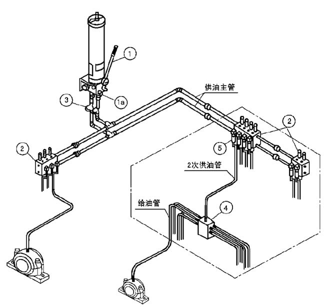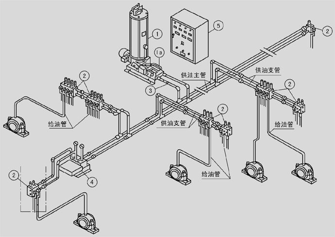 基本動作和前述電動終端式系統(tǒng)相同;二次分配由雙線式分配器②的出油口接二次供油管向遞進式分配器③供油,這樣,雙線式分配器一個出油口可向4-8個潤滑點給油。