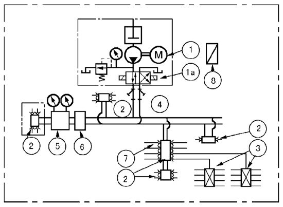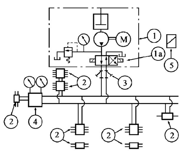 由換向閥1a的位置決定潤滑泵①輸出的潤滑脂經(jīng)兩條供油主管的某一條供送,另一條向貯油器開放。