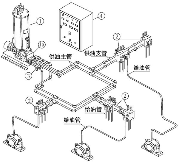 供油主管末端裝有壓力操縱閥④,當末端壓力達到設(shè)定壓力,向電控箱發(fā)送信號,電磁換向閥1a換向,潤滑泵①停止,系統(tǒng)一次給油工作完成。經(jīng)過設(shè)定的時間間隔后,系統(tǒng)再次工作,從另一條主油管供油。