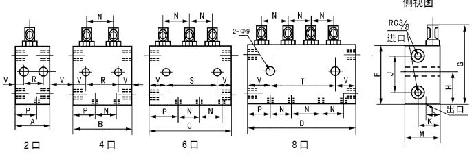 4、在分配器上下對應出油口間設有合二為一的出油結構,易改奇數(shù)出油,使用時只需將孔內的螺釘擰出,把上或 下不用的那個出口用 R1/4 螺塞封堵即可。