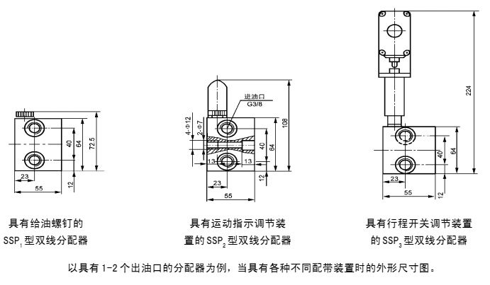 2、帶有行程開關(guān)調(diào)節(jié)裝置的分配器(SSPQ3型),每塊只帶一件限位開關(guān)調(diào)節(jié)裝置,如有特殊需要,每對(duì)出油口都可配帶,須注明配帶數(shù)量,單獨(dú)訂貨。