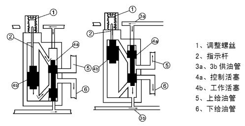 如上圖所示,由泵輸送來的潤滑脂,經(jīng)供油管3a進(jìn)入分配器控制活塞的上端,控制活塞首先向下移動(dòng)(這時(shí)控制活塞下端擠壓的潤滑脂則進(jìn)入卸荷的供油管3b),使工作活塞的上腔與控制活塞的上腔連通,然后工作活塞向下移動(dòng),這時(shí)受工作活塞擠壓的潤滑脂經(jīng)過控制活塞的環(huán)型槽被壓送到出油口6至潤滑點(diǎn),完成第一周期的給油動(dòng)作。切換至供油管3b供油開始第二周期的給油動(dòng)作,分配器活塞按相同的順序反向進(jìn)行前述動(dòng)作,出油口5排送潤滑脂。