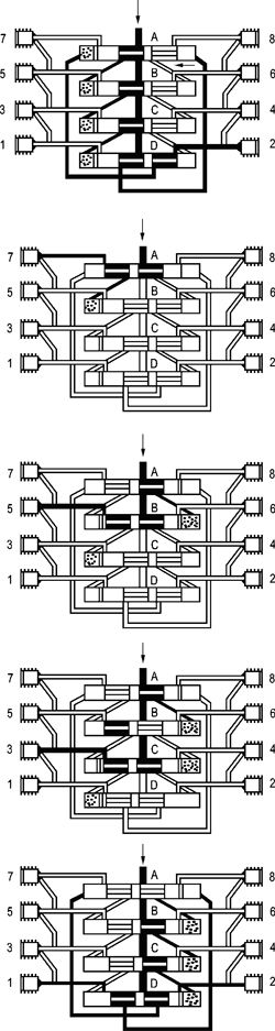 這時(shí)活塞B至D從左側(cè)向右側(cè)運(yùn)動(dòng),按以上相反方向順序動(dòng)作完成一個(gè)周期循環(huán)并可重新開始一個(gè)新的循環(huán)。 |