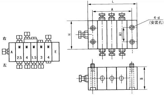 | 說(shuō)明:遞進(jìn)分配器的組合按進(jìn)油口元件首塊A、工作塊M和尾塊E、從左到右排列,在隊(duì)列下方出口稱(chēng)為左,在隊(duì)列上方出口稱(chēng)為右。如圖 |