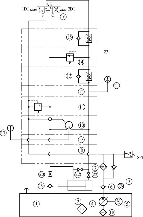 當(dāng)窯體上移到上限值時,行程開關(guān)箱中一觸點(diǎn)動作,油泵 4 停止,換向閥 16 的電磁感應(yīng)圈 B 接通,液壓缸中的油經(jīng)調(diào)速閥 13 和換向閥 16 右位回油箱,窯體靠自重下移,下移到下限值時,行程開關(guān)箱中一觸點(diǎn)動作,換向閥 16 的電 磁感應(yīng)圈 B 斷開,油泵 4 起動,換向閥 16 電磁感應(yīng)圈 A 接通,液壓缸活塞在壓力油作用下,推動擋輪迫使窯體向上移動。