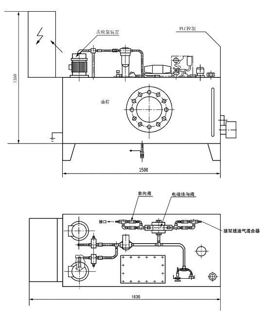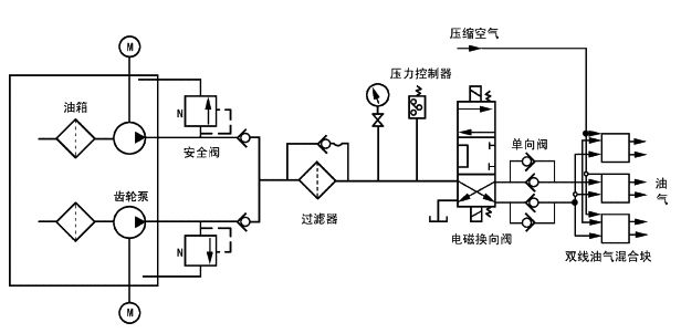 YQ-2型雙線油氣潤(rùn)滑裝置為一種雙線型系統(tǒng),由油氣站,空氣操作盤(pán)和多個(gè)雙線油氣混合器組成。油氣站包括齒輪泵、安全閥、過(guò)濾器、電磁換向閥和PLC電氣控制柜,系統(tǒng)工作時(shí),壓力油經(jīng)齒輪泵壓出,經(jīng)電磁換向閥進(jìn)入油氣混合塊。油氣混合塊包括雙線分配器和混合器兩部分,油在分配器中被定量分配后壓入混合器,在混合器中,定量的油在不間斷壓縮空氣的作用下進(jìn)入潤(rùn)滑點(diǎn)。雙線分配器的兩個(gè)進(jìn)油口一個(gè)進(jìn)油,則另一個(gè)回油,由電磁換向閥切換。