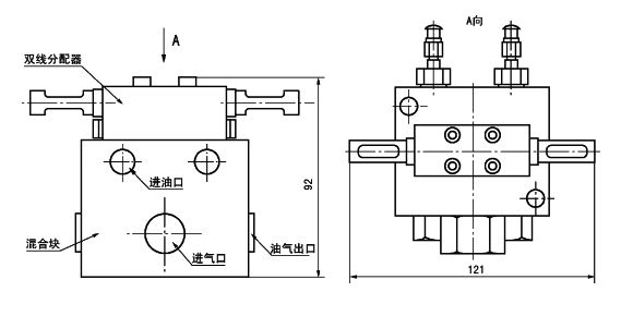 雙線油氣混合器由一個(gè)或多個(gè)雙線分配器和一個(gè)混合塊組成,油在分配器中定量分配后,通過(guò)不間斷壓縮空氣進(jìn)入潤(rùn)滑點(diǎn)。